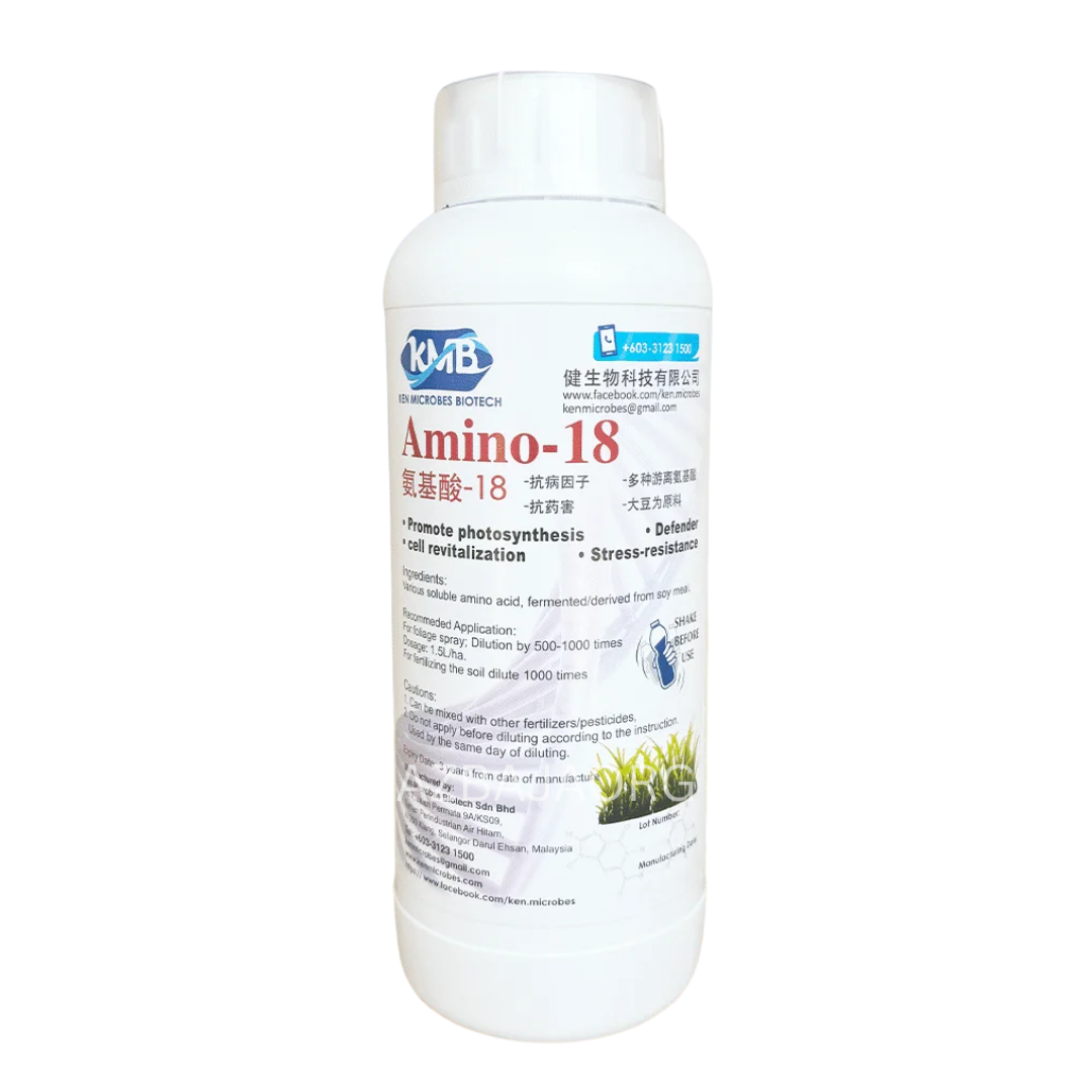 Amino-18, an organic foliar fertilizer produced by Ken Microbes Biotech (KMB). It is primarily used to enhance plant growth and health through direct application to the leaves.
