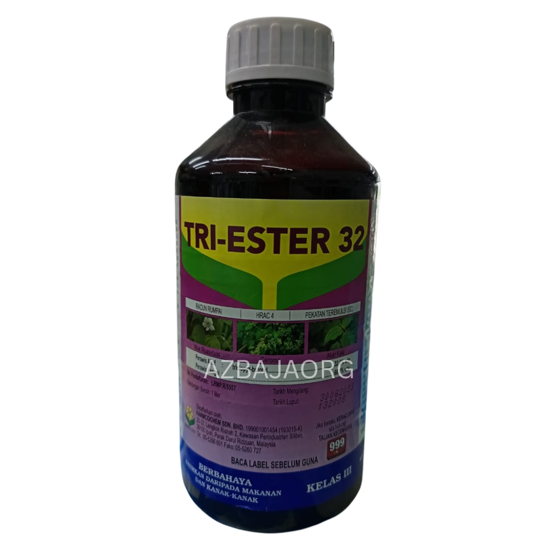 Tri-Ester 32, a selective systemic herbicide manufactured by Farmcochem. It is specifically used for controlling broadleaf weeds, woody shrubs (anak kayu), and various types of grass.